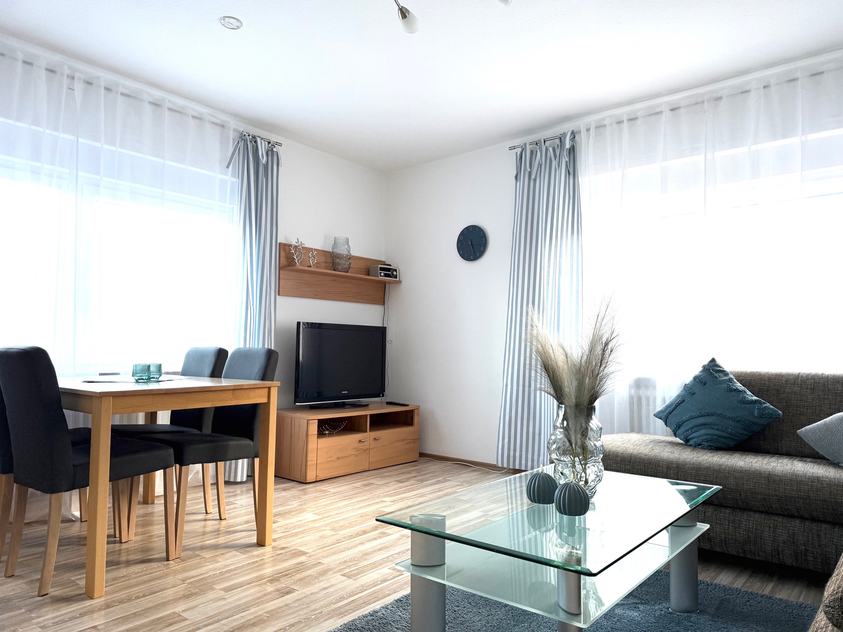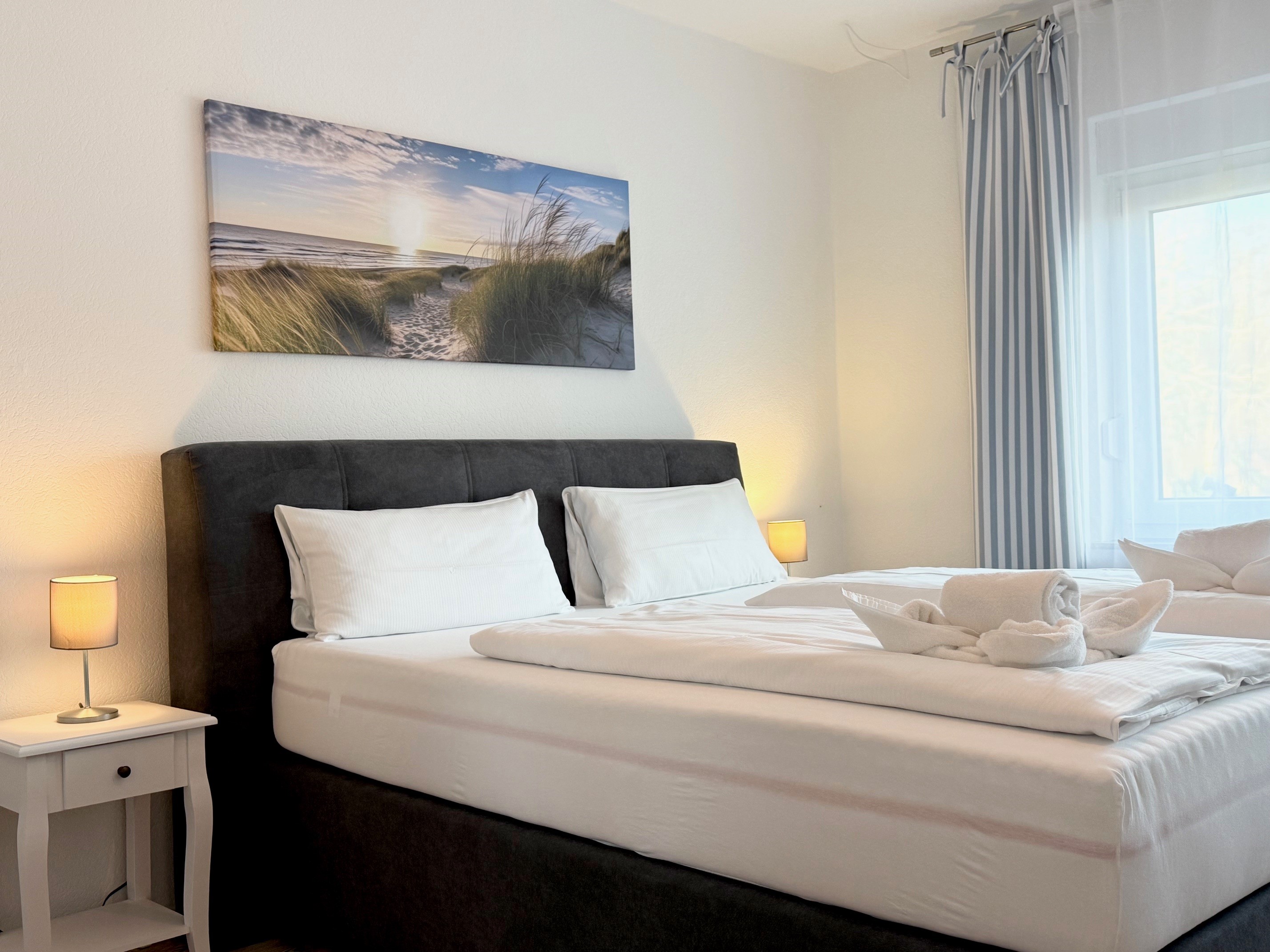 Diese charmant eingerichtete Ferienwohnung befindet sich im Erdgeschoss und eignet sich ideal für den Urlaub von bis zu vier Personen. Das geräumige Wohnzimmer verfügt über eine bequeme Couchgruppe, einen separaten Essplatz und eine komplett ausgestattete Küchenzeile. Die Küchenzeile ist ausgestattet mit einem Ceranfeld, Backofen, Kühlschrank, Toaster, Wasserkocher sowie einer Mikrowolle. Es sind 2 separate Schlafzimmer vorhanden, eins mit Doppelbett und eins mit zwei Einzelbetten). Die Wohnung ist abdunkelbar durch Außenjalousien. Im Wohnzimmer gelangen Sie über eine Treppe in den Hinterhof. Denn zu diesem Haus gehört ein 2000qm großer Garten, welcher frei zur Verfügung steht und die Möglichkeit für gemütliche Grillabende oder Sonnenstunden im Freien bietet. Die angegebenen Preise gelten pro Ferienwohnung und Übernachtung. Wäschepaket (Bettwäsche und Handtücher) zu buchbar.
